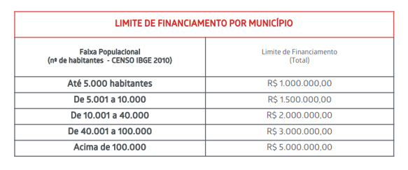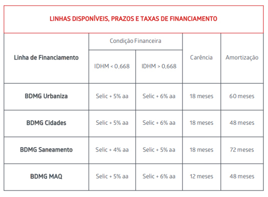 Os recursos disponibilizados na linha de financiamento são próprios do banco e chegarão a todos os municípios, com o limite de financiamento definido de acordo com a faixa populacional. São quatro linhas disponíveis (BDMG Urbaniza, BDMG Cidades, BDMG Saneamento e BDMG MAQ), havendo variações nas condições financeiras e juros de acordo com o Índice de Desenvolvimento Humano Municipal (IDHM), assim como na carência e amortização (veja as tabelas abaixo).